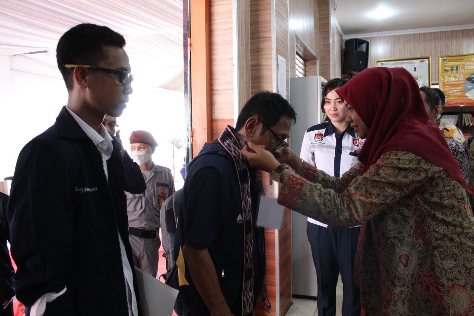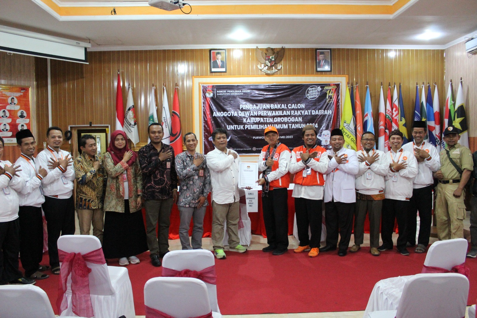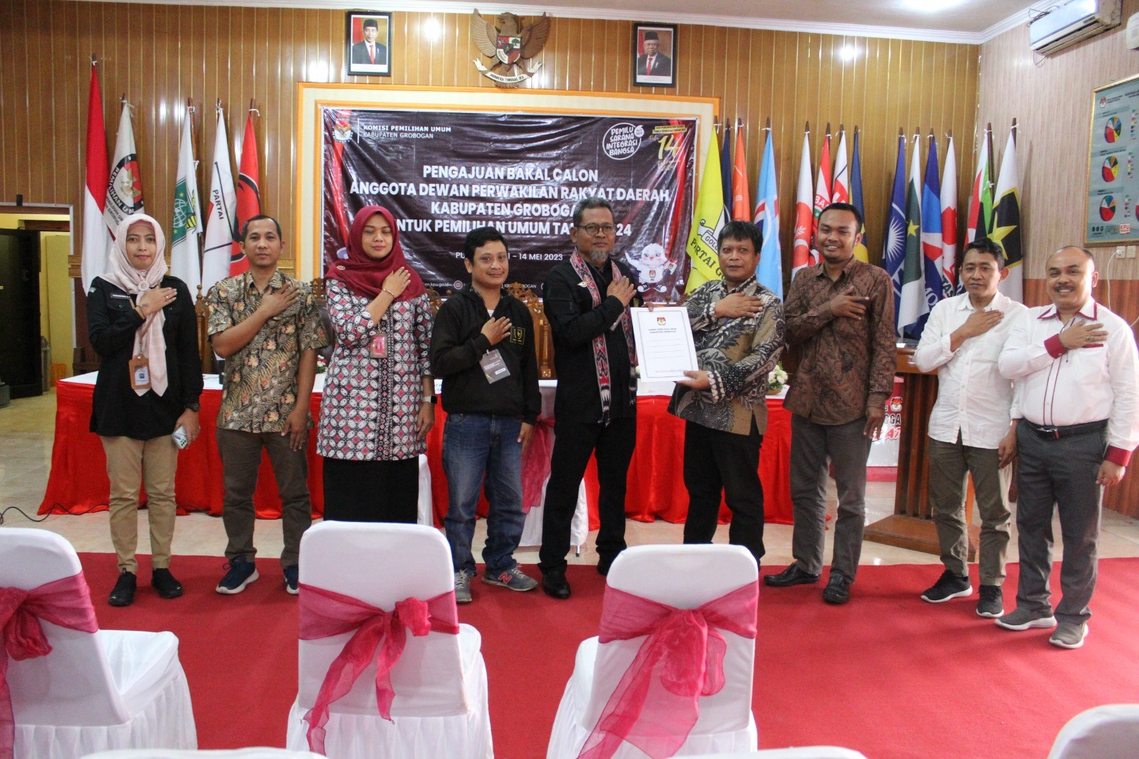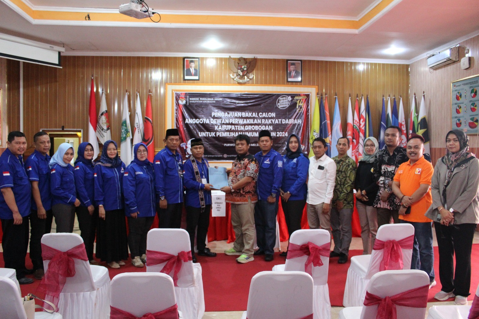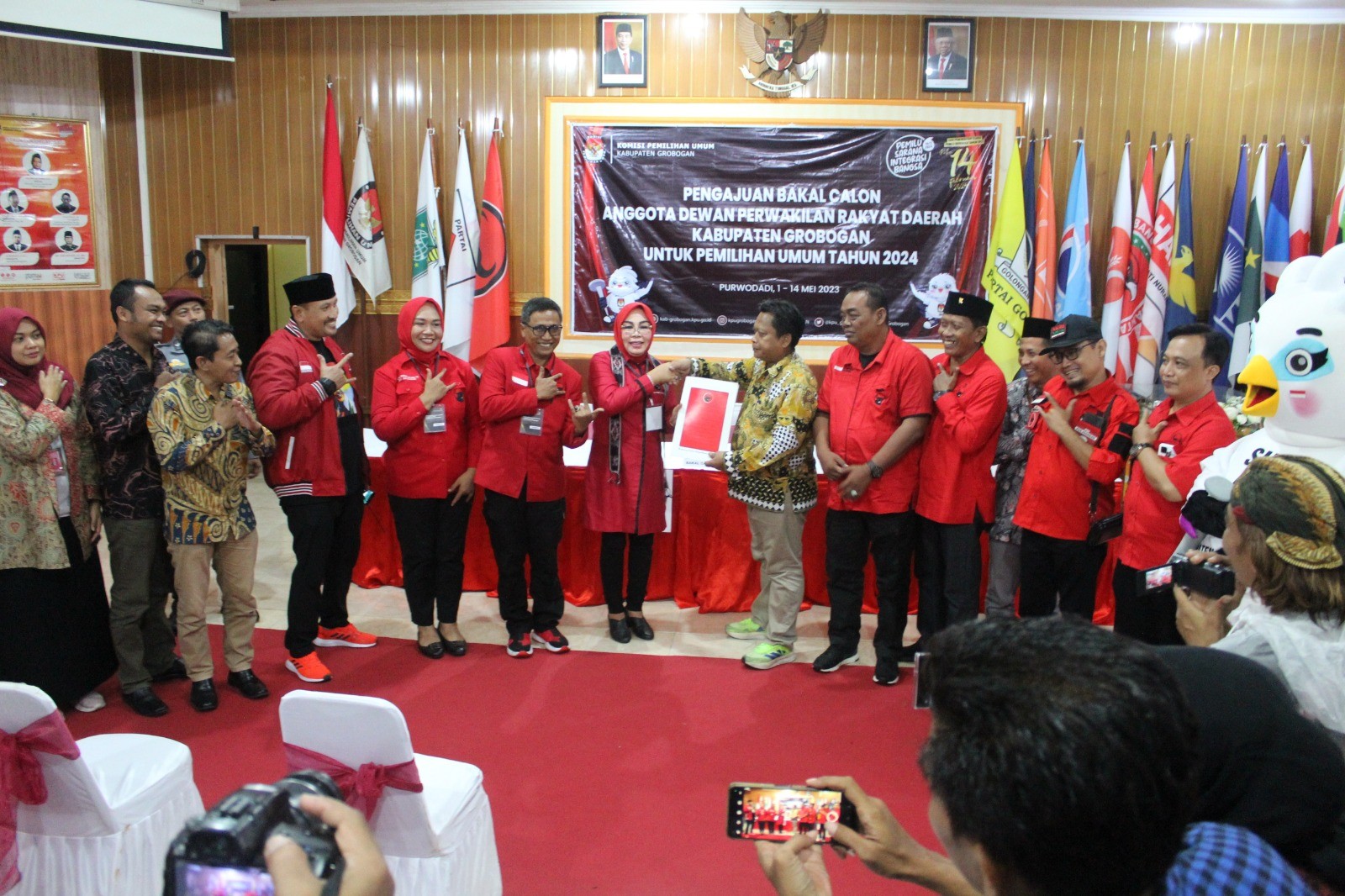 PURWODADI - Kamis, 11 Mei 2023 pukul 15.00 WIB, Partai Demokrasi Indonesia Perjuangan (PDIP) datang ke kantor KPU Kabupaten Grobogan dengan membawa berkas pengajuan bakal calon Anggota DPRD Kabupaten yang sebelumnya telah diunggah di Sistem Informasi Pencalonan (SILON). Hadir pada saat itu adalah Ketua Partai PDIP tingkat Kabupaten Gorobgan Ibu Hj. Sri Sumarni, SH, MM dan Petugas Penghubung (LO) Partai PDIP Bapak Yoyok Prihantoro. Kehadiran Partai PDIP diterima dengan hangat oleh Ketua KPU Kabupaten Grobogan. Setelah menyematkan cindera mata, Agung Sutopo, secara resmi menyambut rombongan Partai PDIP. Dalam sambutannya Agung mengucapkan apresiasi kepada Partai PDIP karena telah berhasil menyelesaikan tahapan pendaftaran pengajuan bakal calon Anggota DPRD Kabupaten. Agung juga berharap semoga tahapan ini bisa berjalan lancar hingga penetapan DCT. Sementara Sri Sumarni berharap, dengan proses pengajuan bakal calon Anggota DPRD ini Partai PDIP dapat turut serta meramaikan pesta demokrasi yang akan digelar tahun 2024 mendatang, tak lupa beliau mengucapkan terimakasih kepada KPU Kabupaten Grobogan atas penyambutan yang dilakukan. Setelah dokumen pengajuan bakal calon Anggota DPRD Kabupaten Grobogan diterima oleh Ketua KPU Kabupaten Grobogan, untuk kemudian dilakukan pemeriksaan, dan dinyatakan lengkap. Berita Acara dan Tanda Terima Penerimaan Berkas Pengajuan diserahkan oleh Agung Sutopo, kepada ketua Partai PDIP tingkat Kabupaten Grobogan.