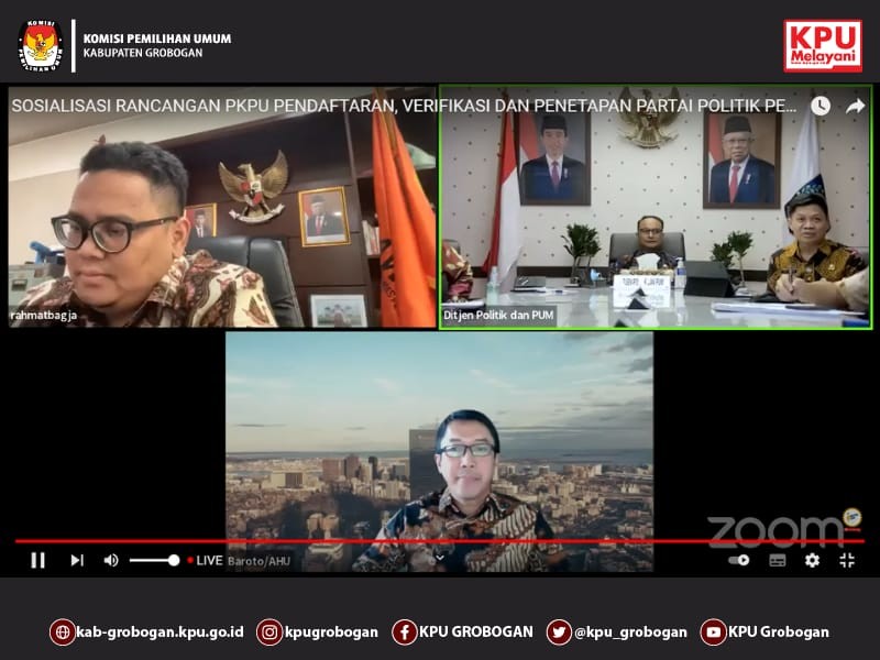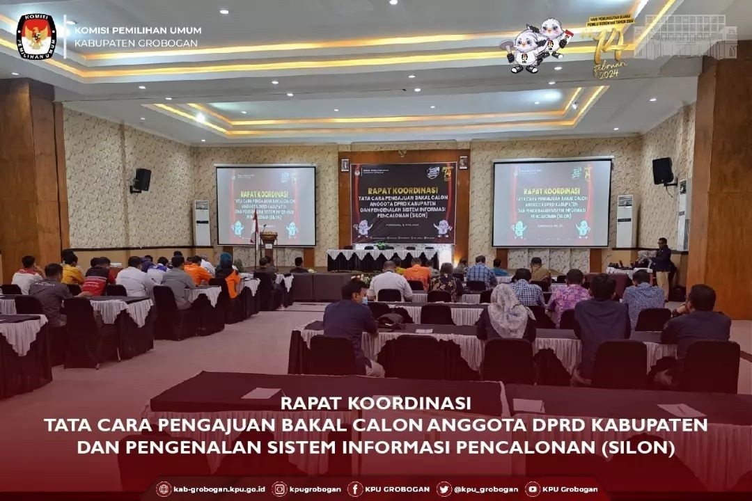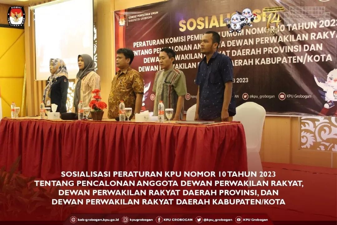 PURWODADI - Selasa, 2 Mei 2023 KPU Kabupaten Grobogan menggelar Sosialisasi Peraturan Komisi Pemilihan Umum Nomor 10 Tahun 2023 tentang Pencalonan Anggota Dewan Perwakilan Rakyat, Dewan Perwakilan Rakyat Daerah Provinsi Dan Dewan Perwakilan Rakyat Daerah Kabupaten/Kota bertempat di Hotel 21 Purwodadi, Jl. MT Haryono No. 137 Purwodadi. Berkesempatan hadir secara pribadi dan membuka acara tersebut adalah Ketua KPU Kabupaten Grobogan Agung Sutopo, S. Pi. Beliau menjelaskan bahwa untuk melaksanakan tahapan pencalonan ini, KPU sangat membutuhkan dukungan dari Partai Politik yang ada di Kabupaten Grobogan dan bantuan dari dinas/instansi terkait. Diakrenakan waktu pendaftaran bakal calon anggota legislatif ini hanya berlangsung selama 14 ( empat belas) hari saja, yaitu dari tanggal 1 - 14 Mei 2023. Hadir sebagai tamu undangan adalah Kepala Dinas/Instansi terkait yang ada di Kabupaten Grobogan, Direktur BUMD di Kabupaten Grobogan, perwakilan Partai Politik dan Media. Materi inti tentang Peraturan Komisi Pemilihan Umum Nomor 10 Tahun 2023 disampaikan oleh Anggota KPU Kabupaten Grobogan Divisi Teknis Penyelenggaraan, Suwiknyo, S. Pd. I. Point-point penting dalam Peraturan Komisi Pemilihan Umum Nomor 10 Tahun 2023 dijelaskan secara rinci, sehingga hadirin yang hadir mengetahui hal-hal apa saja yang harus disiapkan ketika hendak mendaftar sebagai calon legislatif. Materi yang disampaikan sangat menarik, terbukti dari antusias tamu undangan untuk memberikan tanggapan dan masukan, seperti perwakilan Partai Nasdem, perwakilan RSUD. Dr. R. Soejdati Purwodadi dan dari perwakilan Media.