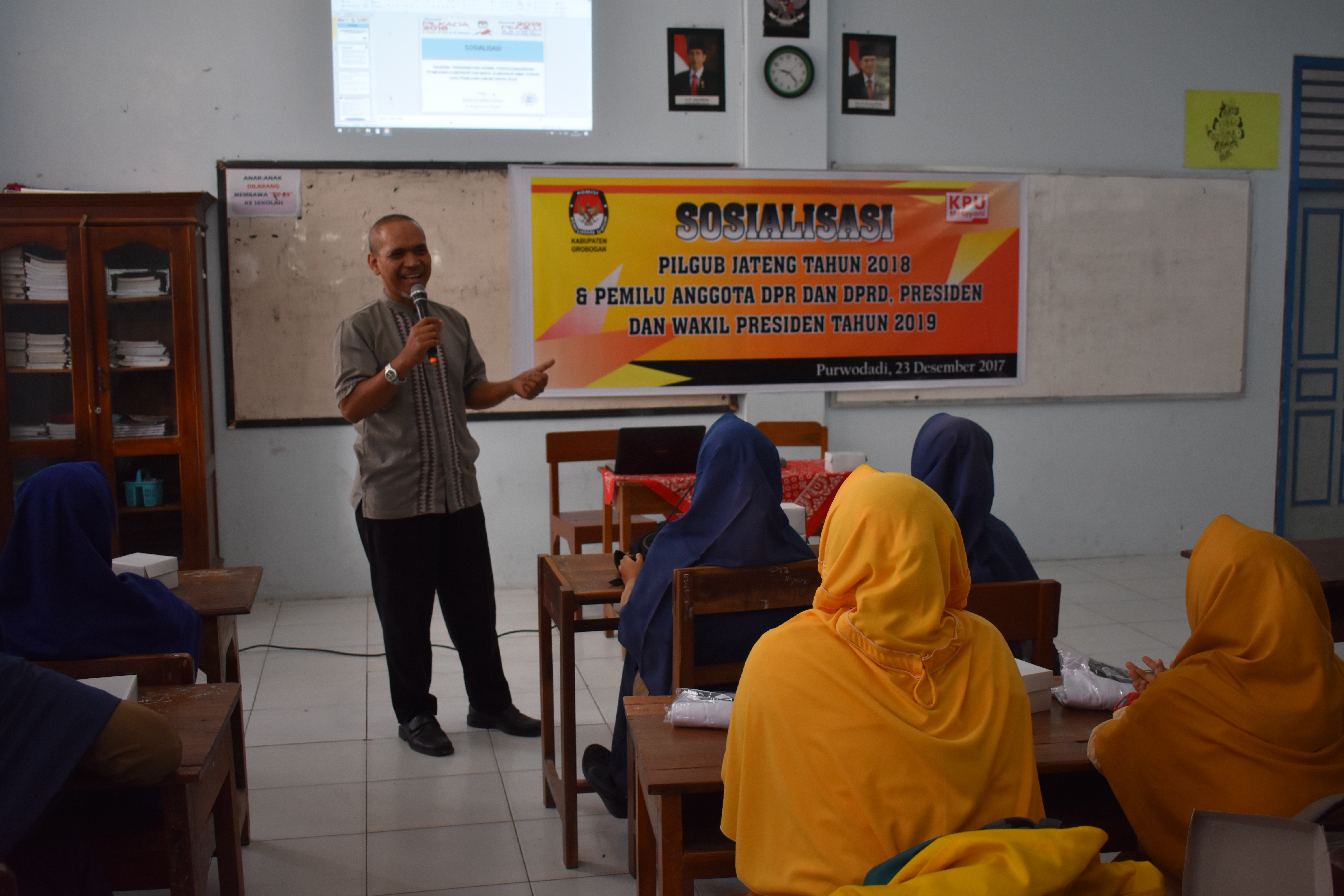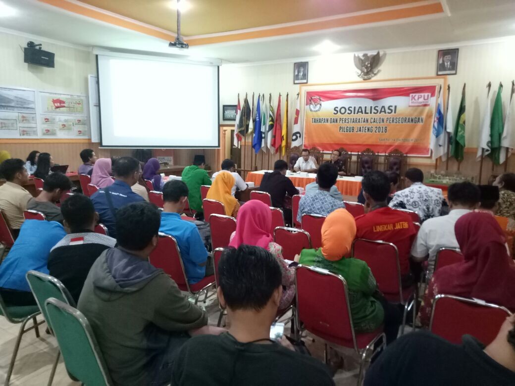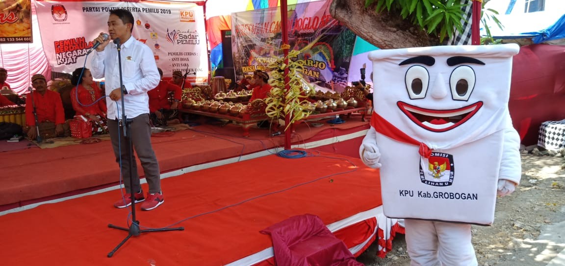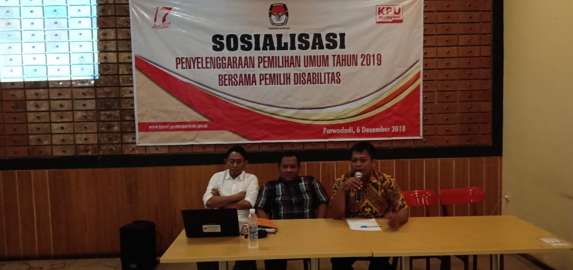 Bertempat di Aula RM. Noroyono, KPU Kab. Grobogan menggelar Sosialisasi Penyelenggaraan Pemilu 2019 bersama Pemilih Penyandang Disabilitas, pada Kamis, 6 Desember 2018. Sosialisasi kali ini bertujuan untuk meningkatkan hak pilih di kalangan pemilih penyandang disabilitas, juga untuk memberikan informasi kepemiluan yang berkaitan dengan segmen pemilih penyandang disabilitas. Sambutan Ketua KPU Kab. Grobogan, Bapak Agung Sutopo, S. Pi mengawali acara tersebut, dilanjutkan dengan sambutan Bapak Sunar sebagai Ketua Komunitas Penyandang Disabilitas Kab. Grobogan, tak lupa pemaparan materi oleh Anggota KPU Kab. Grobogan Bapak Ngatiman, SE. Sosialisasi kali ini sangat interaktif, karena pada saat dibuka sesi tanya jawab, banyak sekali informasi yang dibagi berkaitan dengan kondisi penyandang disabilitas di Kab. Grobogan dan tata cara pemungutan suara di TPS nantinya. Simulasi pemungutan suara juga dilakukan, untuk penyandang tuna netra dan tuna daksa. Semoga dengan adanya acara sosialisasi ini, makin banyak penyandang disabilitas di Kab. Grobogan yang turut serta memberikan suara pada Pemilihan Umum 2019, sehingga meningkatkan jumlah partisipasi pemilih di Kab. Grobogan