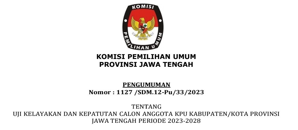PENGUMUMAN UJI KELAYAKAN DAN KEPATUTAN CALON ANGGOTA KPU KABUPATEN/KOTA PADA 9 KABUPATEN/KOTA DI PROVINSI JAWA TENGAH PERIODE 2023-2028 dapat diakses di sini