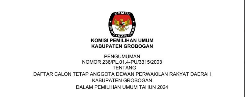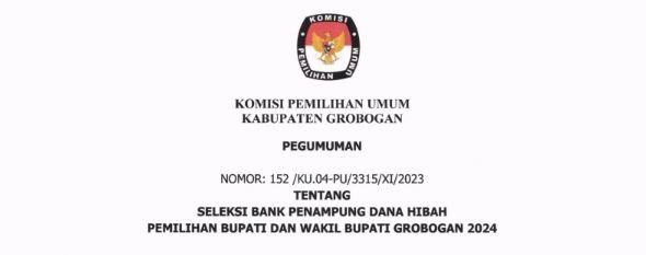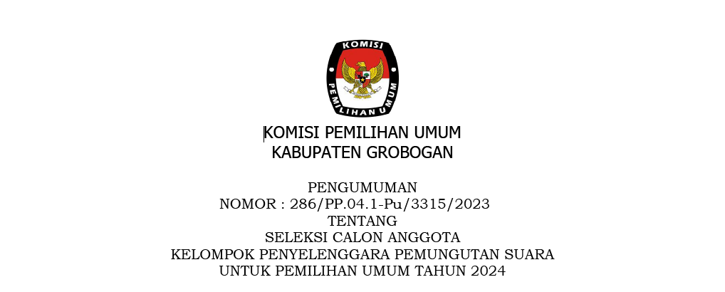 Berikut Kami sampaikan Pengumuman Nomor : 303/PP.04.1-Pu/3315/2023 tentang Hasil Penelitian Administrasi Calon Anggota Kelompok Penyelenggara Pemungutan Suara Untuk Pemilihan Umum Tahun 2024 Se-Kabupaten Grobogan yang dapat diakses di sini