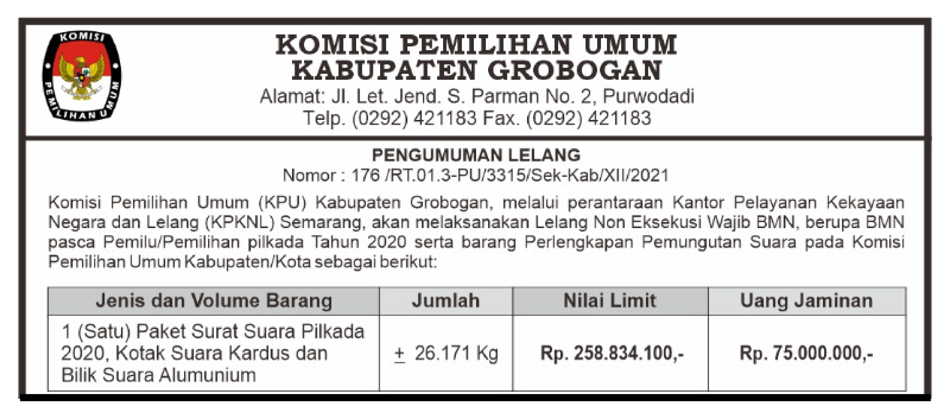 Komisi Pemilihan Umum (KPU) Kabupaten Grobogan, melalui perantara Kantor Pelayanan Kekayaan Negara dan Lelang (KPKNL) Semarang, akan melaksanakan Lelang Non Eksekusi Wajib BMN, berupa BMN pasca Pemilu/Pemilihan pilkada Tahun 2020 serta barang Pelengkapan Pemungutan Suara pada Komisi Pemilihan Umum Kabupaten/Kota berupa 1 (satu) Paket Surat Suara Pilkada 2020, Kotak Suara Kardus dan Bilik Suara Alumunium.