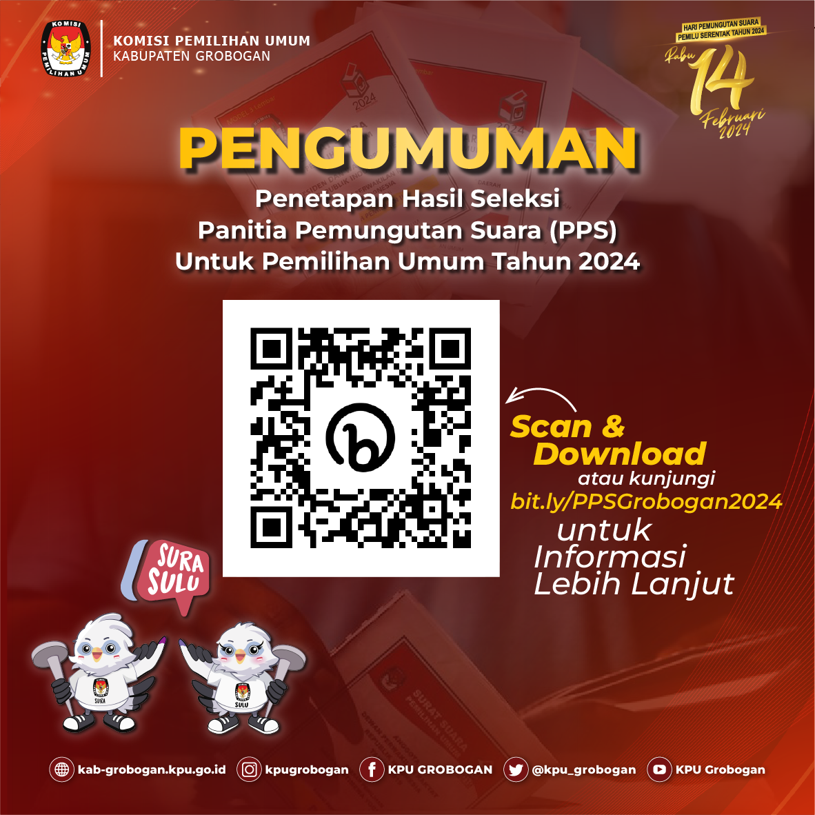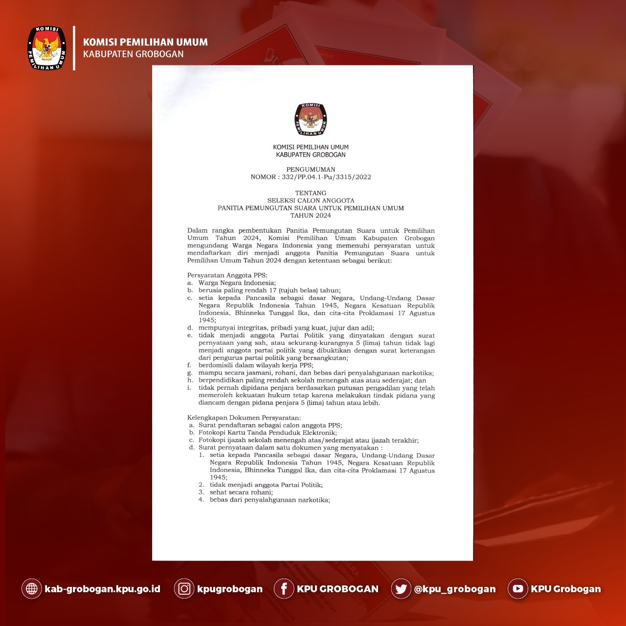 Pengumuman Seleksi Calon Anggota Panitia Pemungutan Suara (PPS) Untuk Pemilihan Umum Tahun 2024 Kabupaten Grobogan Minggu, 18 Desember 2022 00:00 1767 Pengumuman Seleksi Calon Anggota Panitia Pemungutan Suara (PPS) Untuk Pemilihan Umum Tahun 2024. Unduh Baca Selengkapnya