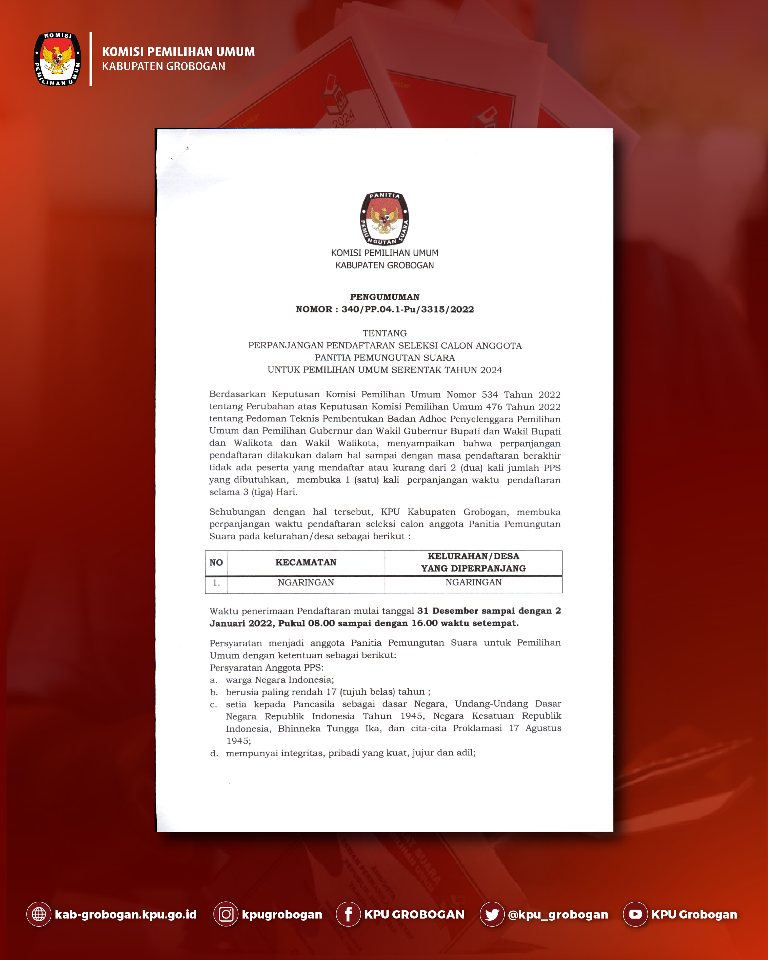 Pengumuman Perpanjangan Pendaftaran Seleksi Calon Anggota Panitia Pemungutan Suara Untuk Pemilihan Umum Serentah Tahun 2024 KPU Kabupaten Grobogan Sabtu, 31 Desember 2022 07:00 286 Pengumuman Perpanjangan Pendaftaran Seleksi Calon Anggota Panitia Pemungutan Suara Untuk Pemilihan Umum Serentah Tahun 2024 KPU Kabupaten Grobogan. Unduh Baca Selengkapnya